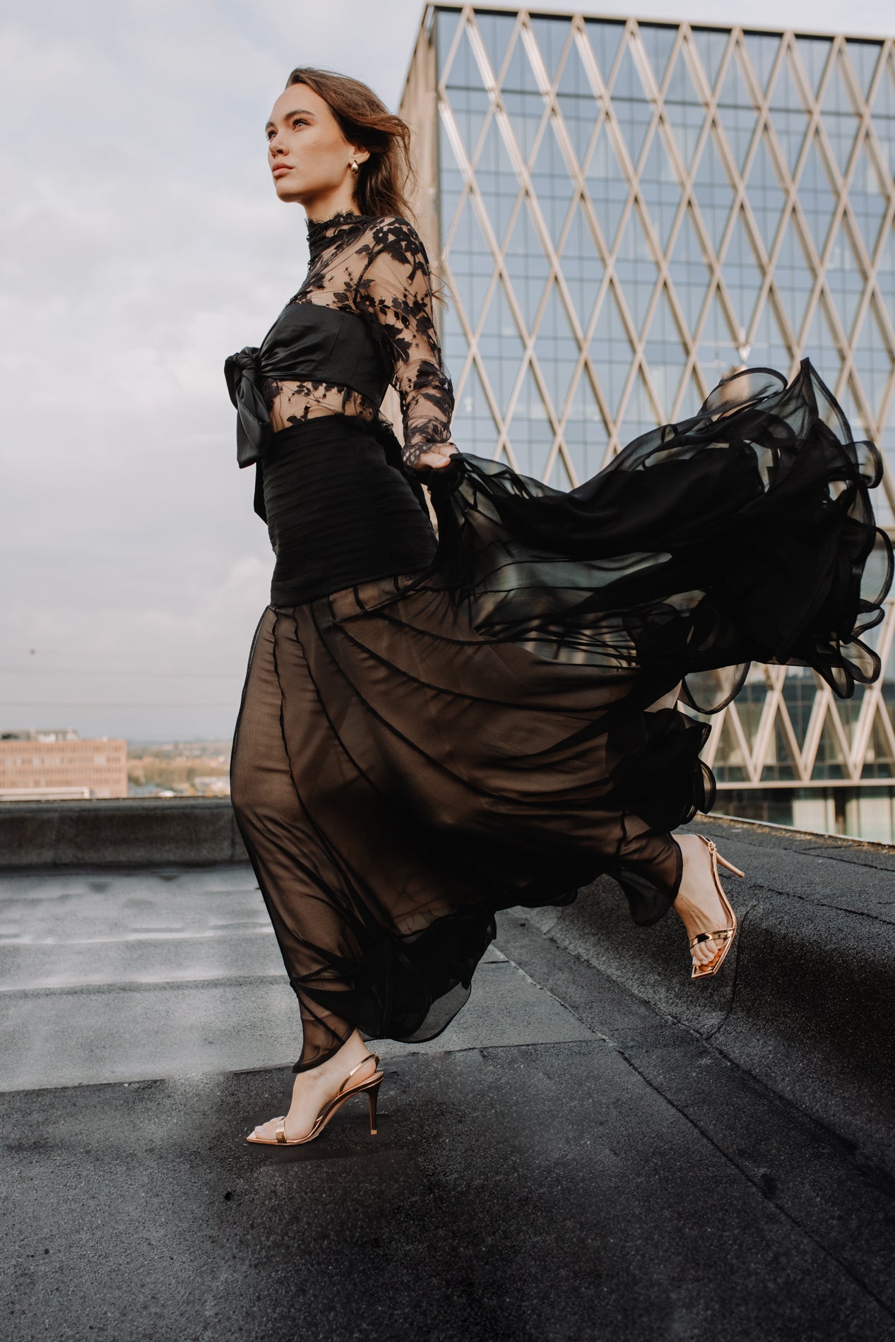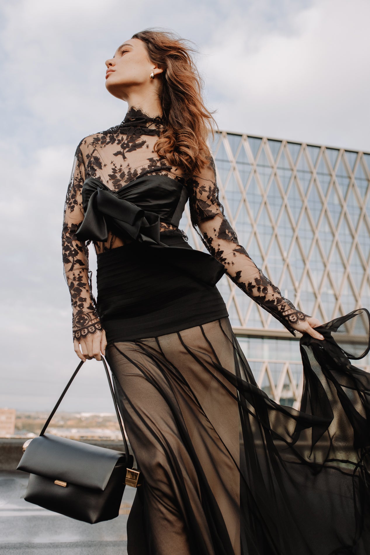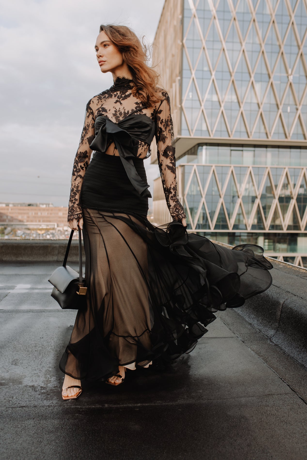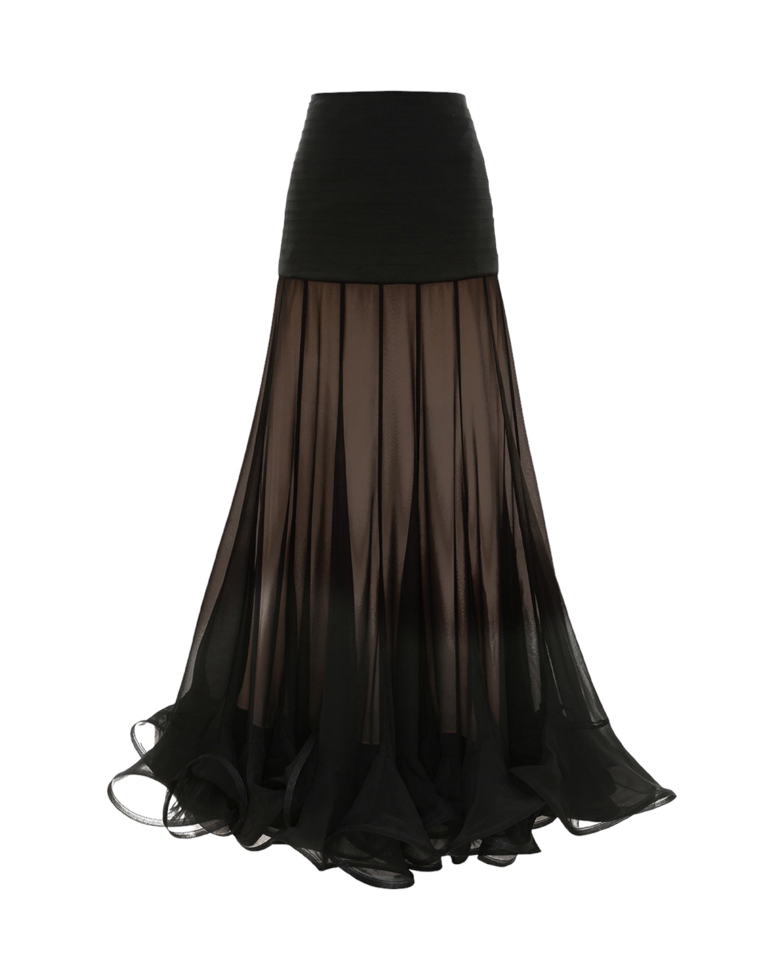The Illustration Flounce Skirt in Black from The Zimmermann Fall 2024 Collection, In Illustration. A silk maxi skirt featuring a pleated waist and sheer skirt with crinoline hem.